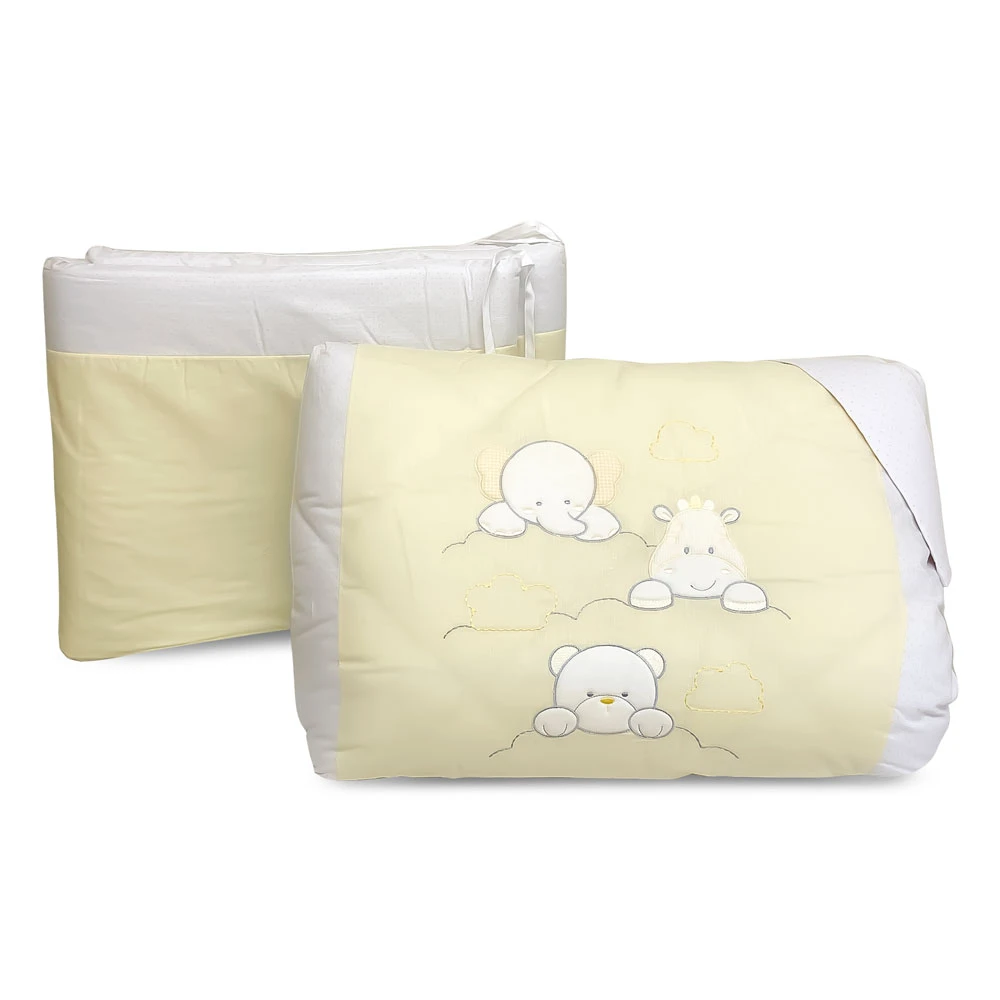 Bebitaly 4pz Set Letto Amici con Piumone Sfoderabile, Paracolpi, Federa di Bebitaly è un morbido set letto composto da piumino (108 x 139 cm – poliestere), paracolpi (55 + 60 + 55 h40 cm – cotone), federa letto (40 x 55 cm – cotone) e copripiumino (112 x 142 cm – cotone). Decorato con 3 simpatici animali!