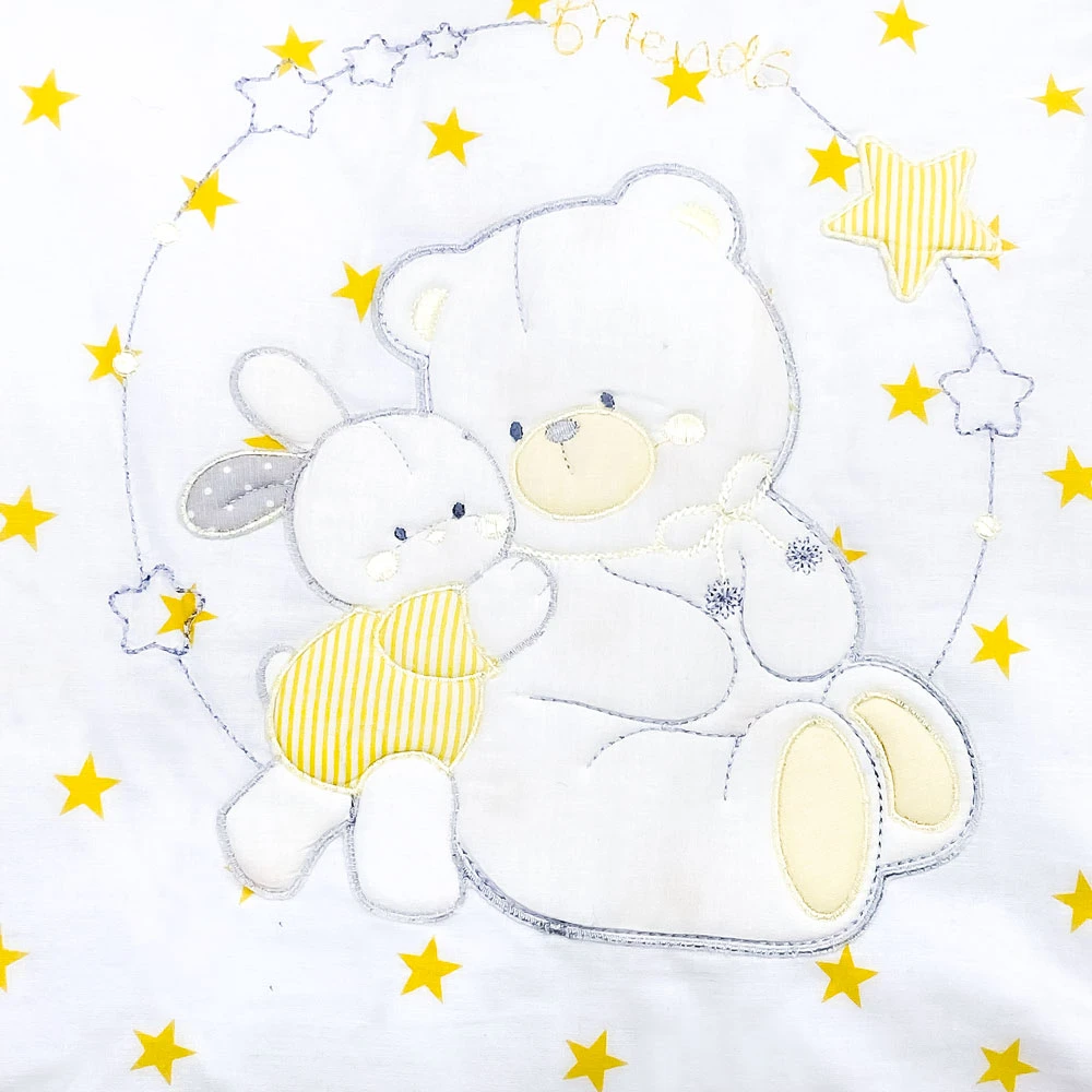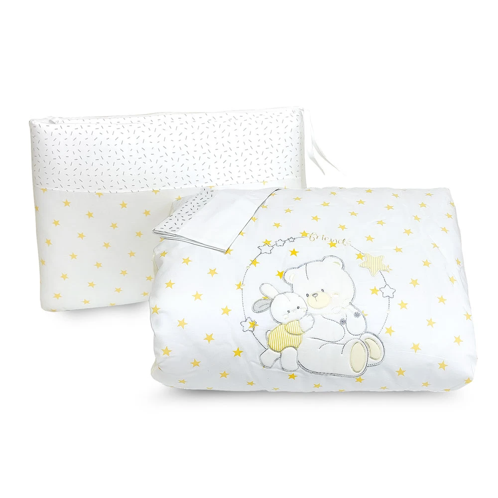 Bebitaly 4pz Set Letto Friends con Piumone Sfoderabile, Paracolpi, Federa di Bebitaly è un morbido set letto composto da piumino (108 x 139 cm – poliestere), paracolpi (55 + 60 + 55 h40 cm – cotone), federa letto (40 x 55 cm – cotone) e copripiumino (112 x 142 cm – cotone). Decorato con due simpatici animali!