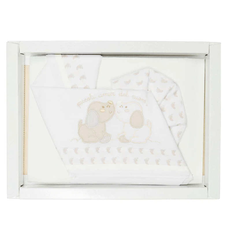 Bebitaly Set 3pz Lenzuola Culla Piccoli Amici del Cuore di Bebitaly realizzato in morbido cotone, è composto da: lenzuola sopra, lenzuola sotto con angoli e fodera per cuscino. É compatibile con la maggior parte delle culle di dimensioni standard. Misura: 40 x 75 cm.