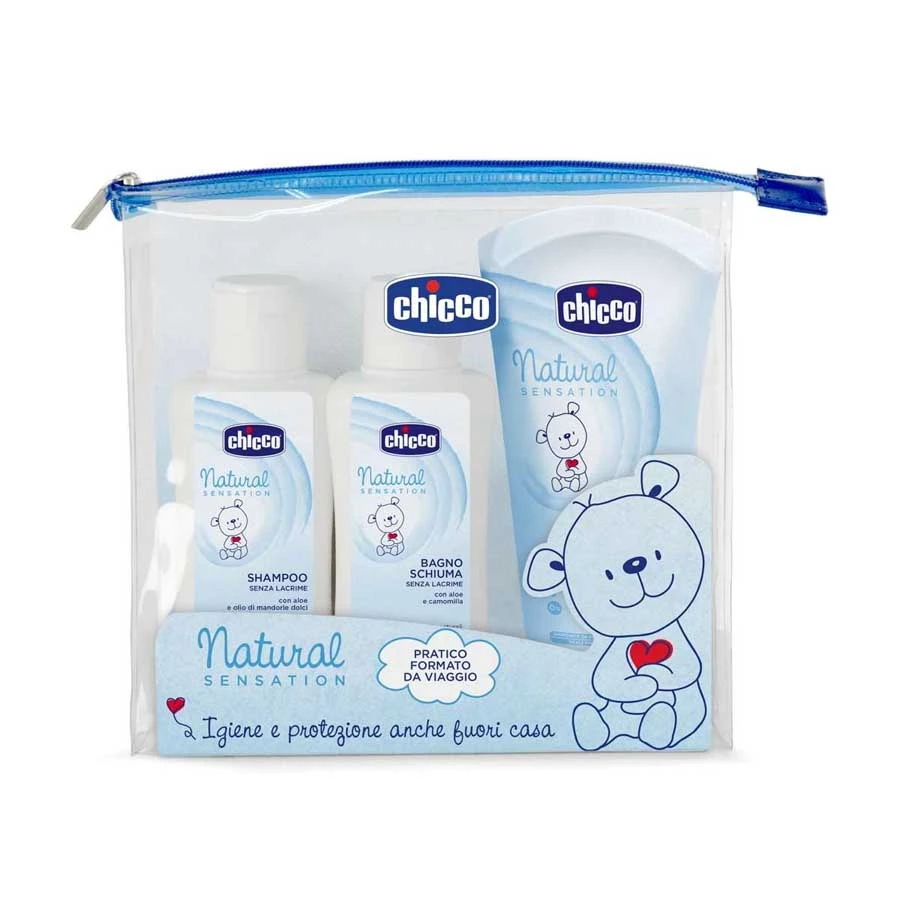 Travel Kit Natural Sensation di Chicco offre tutto il necessario per detergere e nutrire la pelle del tuo bambino in un pratico Kit da Viaggio, con custodia impermeabile e chiusura ermetica. Comprende Shampoo Senza Lacrime da 100ml, Bagno Schiuma Senza Lacrime da 100ml, Crema Corpo da 100ml.