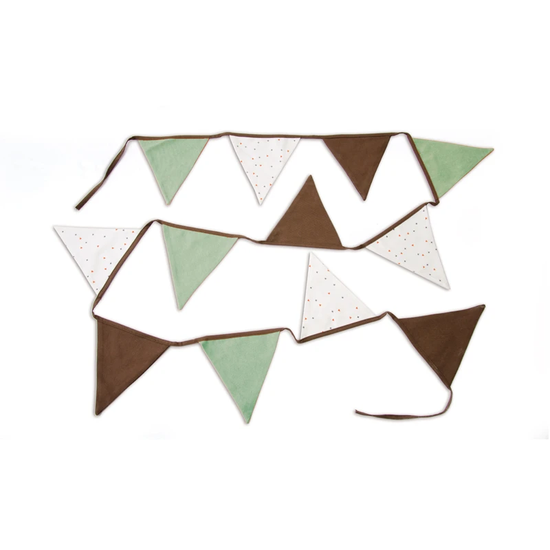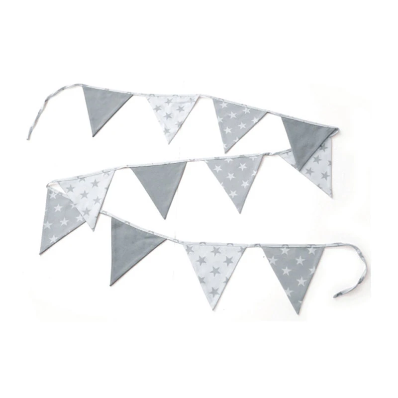 Cuoricini Bandierine Moovie per Cameretta di Cuoricini si appendono alle pareti o ai mobili per regalare un tocco di design e allegria alla prima stanzetta del tuo piccolo! Sono realizzate in tessuto con motivi astratti e molto decorativi. Hanno una lunghezza di 3 metri e sono disponibili in colore Grigio, Salvia.