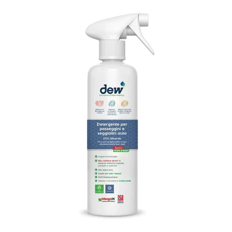 Dew Detergente per Passeggini e Seggiolini Auto 500ml di Dew è realizzata con una formula antibatterica a base di acqua elettrolizzata che rimuove macchie, grasso, unto e sporco dal tessuto e dalle superfici. Elimina il 99,9% di germi e batteri. Ideale per pulire tessuto e parti dure di seggiolini auto, navicelle e passeggini.