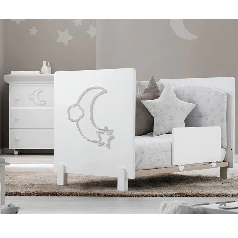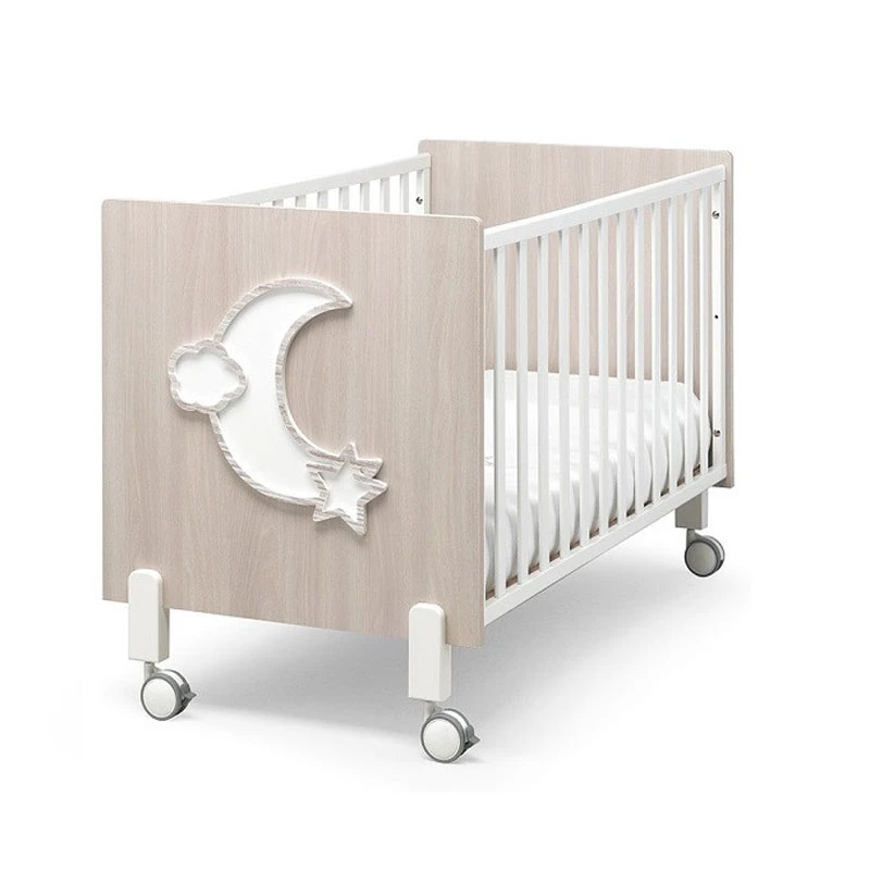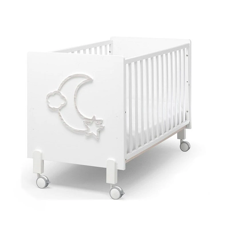 Sulla spalliera del Lettino Little Moon è posizionato un pannello in plexiglass serigrafato su entrambi i lati e pantografato dal lato a vista. Il pannello è adornato da una luminosa e romantica luna, illuminata da una fascia a led di cui è possibile modulare intensità e colore, che regala un’atmosfera unica e magica alla stanzetta del tuo bambino! La struttura del lettino è realizzata in legno di faggio e truciolare/MDF e verniciata con vernici atossiche. Le 4 ruote piroettanti si regolano in altezza e sono dotate di sistema frenante, nella parte inferiore è disposto un ampio cassettone per la biancheria. Le sponde laterali sono regolabili, una di queste è anche completamente removibile: una volta che il bambino sarà cresciuto abbastanza per salire e scendere dal letto in autonomia, sarà possibile installare al posto della sponda laterale il Pannello Salva Cadute Moon!