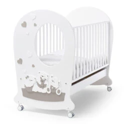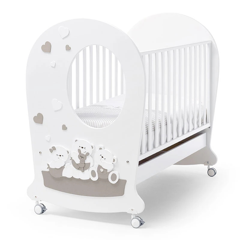 Erbesi Lettino Mirtillone in Legno di Faggio Massello, con sistema a Dondolo – Bianco e Tortora ha una robusta struttura in legno di faggio massello con sponde regolabili in altezza: lo sbloccaggio della sponda avviene effettuando due movimenti sequenziali, questo impedisce che la sponda possa sbloccarsi accidentalmente quando il bambino è dentro. La sponda, inoltre, è anche removibile: questo agevola l’entrata e l’uscita del bambino quando quest’ultimo sarà abbastanza grande da farlo in autonomia. Il lettino è interamente dipinto con vernici atossiche e ha tutti gli angoli arrotondati per garantire una maggior sicurezza. La rete a doghe in legno di faggio assicura una corretta traspirazione del corpo, inoltre nella parte inferiore è presente un ampio cassettone in truciolare rivestito in PVC estraibile da entrambi i lati. Le rotelle piroettanti in gomma anti traccia possono essere rimosse per sfruttare l’effetto dondolo.