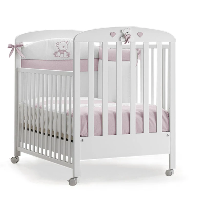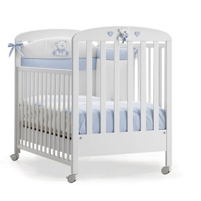 Il Lettino Tatino è realizzato in legno massello di faggio, robusto e molto sicuro, ed è provvisto di sponde mobili integrate di sistema di movimento Secur-Baby che permette di regolare le sponde con due movimenti susseguenti attivabili solo un adulto. Ha 4 ruote piroettanti con gomma anti rigatura per spostarlo facilmente da una stanza all’altra e due di esse sono dotate di sistema frenante. Erbesi Lettino Tatino è decorato a mano con vernici atossiche e impreziosito da due dolci orsetti in rilievo con fiocchetto colorati, circondanti da tanti cuoricini.