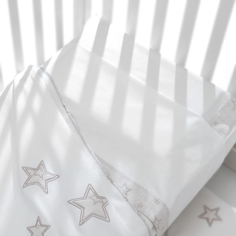 Erbesi Set 3pz Lenzuola Star con Lenzuolo sopra, Lenzuolo con angoli e Cuscino – Tortora è perfetto da abbinare al Lettino Star Erbesi. Include 1 Lenzuolo sotto con angoli, 1 Lenzuolo sopra e 1 Federa per cuscino. 100% cotone.