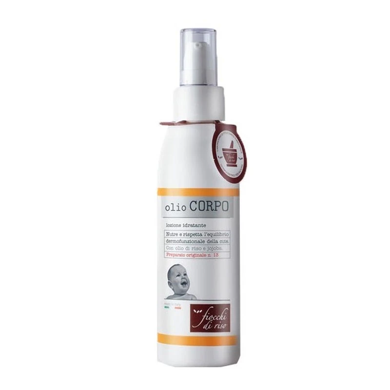 Fiocchi di Riso Olio Corpo 140ml di Fiocchi di Riso nutre e idrata in profondità la cute del neonato preservandone il naturale film idrolipidico. Si assorbe rapidamente ed è ideale per nutrire le pelli più secce e irritate. Combina l’Olio di Riso de Crusca, arricchito da vitamina E e acido fitico, dalle proprietà emollienti e noto perché contrasta l’ossidazione del tessuti rallentando il fotoinvecchiamento cutaneo; e l’Olio di Jojoba che contiene flavonoidi e tocoferoli dalle proprietà antiossidanti. L’Olio di Jojoba è una cera liquida molto particolare perché, a differenza degli altri olii naturali che contengono trigliceridi, questo olio è composto da esteri dell’acido erucico e palmitico. Grazie alla sua conformazione infatti risulta particolarmente affine a rafforzare il naturale film idrolipidico della pelle.