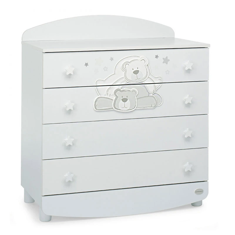 Foppapedretti Cassettiera in Legno Dolcestella di Foppapedretti offre 4 ampi cassetti scorrevoli con graziose maniglie a forma di stella che permettono di organizzare il vestiario e la biancheria del bambino. La Cassettiera Dolcestella Foppapedretti offre un ampio piano superiore su cui è collocabile il materassino imbottito (non incluso) e quindi trasformabile in fasciatoio. 100% Made in Italy.