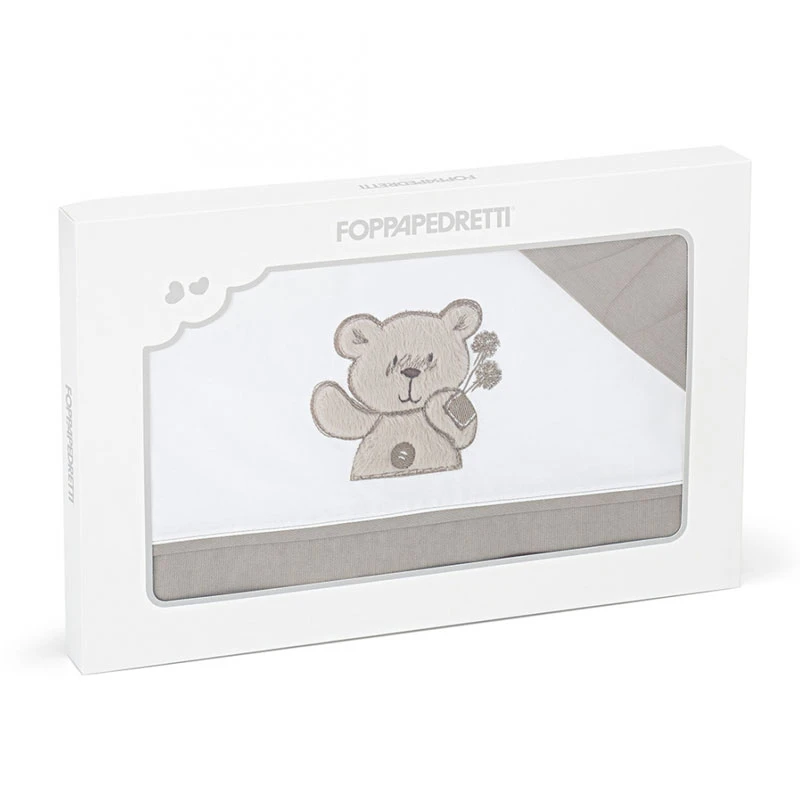 Foppapedretti Completo 3pz Lenzuolo My Little Love con Coprimaterasso e Federa di Foppapedretti è un morbido set tessile realizzato in 100% cotone che include: 1 lenzuolo sopra in cotone (h 168 x l 120 cm), 1 coprimaterasso angolato (h 124 x l 62 cm), federa (h 35 x l 57 cm).