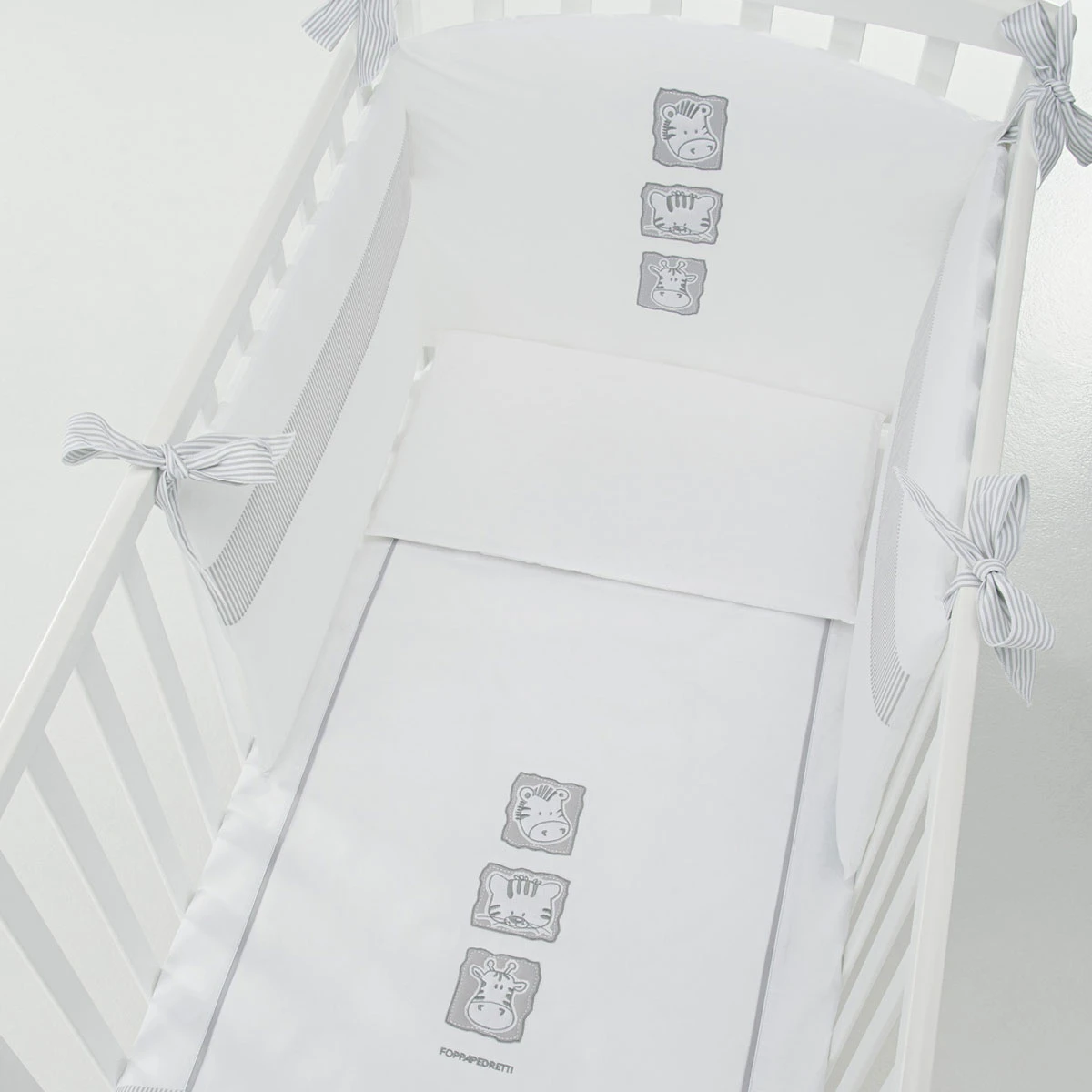 Foppapedretti Completo Piumone, Paracolpi e Federa per Letto Babyzoo è impreziosito da simpatici ricami di animali, colorati nelle tinte del grigio. Il set tessile è composto da paracolpi imbottito, piumone sfoderabile e federa per cuscino i quali si adattano perfettamente al Lettino Babyzoo.