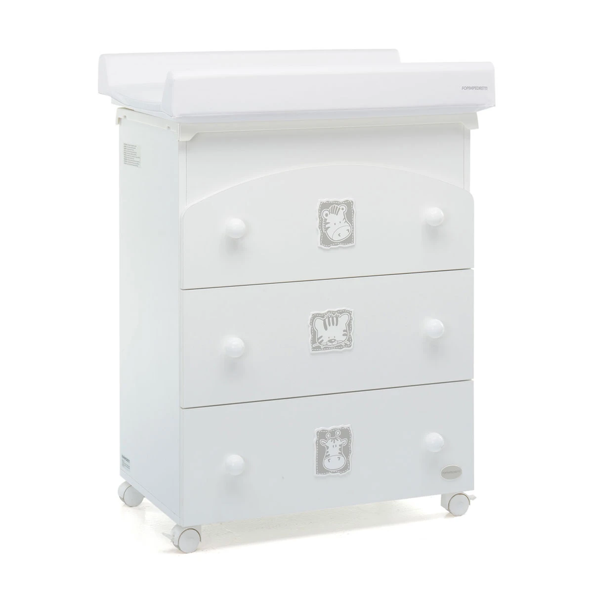 Regala alla stanza del tuo bambino un’atmosfera unica e speciale con Foppapedretti Bagnetto Fasciatoio Babyzoo! Si trasforma in una comoda cassettiera ed è dotato di vaschetta per il bagnetto e di piano ribaltabile con sistema di sicurezza ammortizzato e comodo materassino. I cassetti sono impreziositi con simpatici animaletti colorati, le ruote sono fornite di sistema frenante per facilitare ogni spostamento. La robusta struttura è realizzata in 100% Made in Italy.