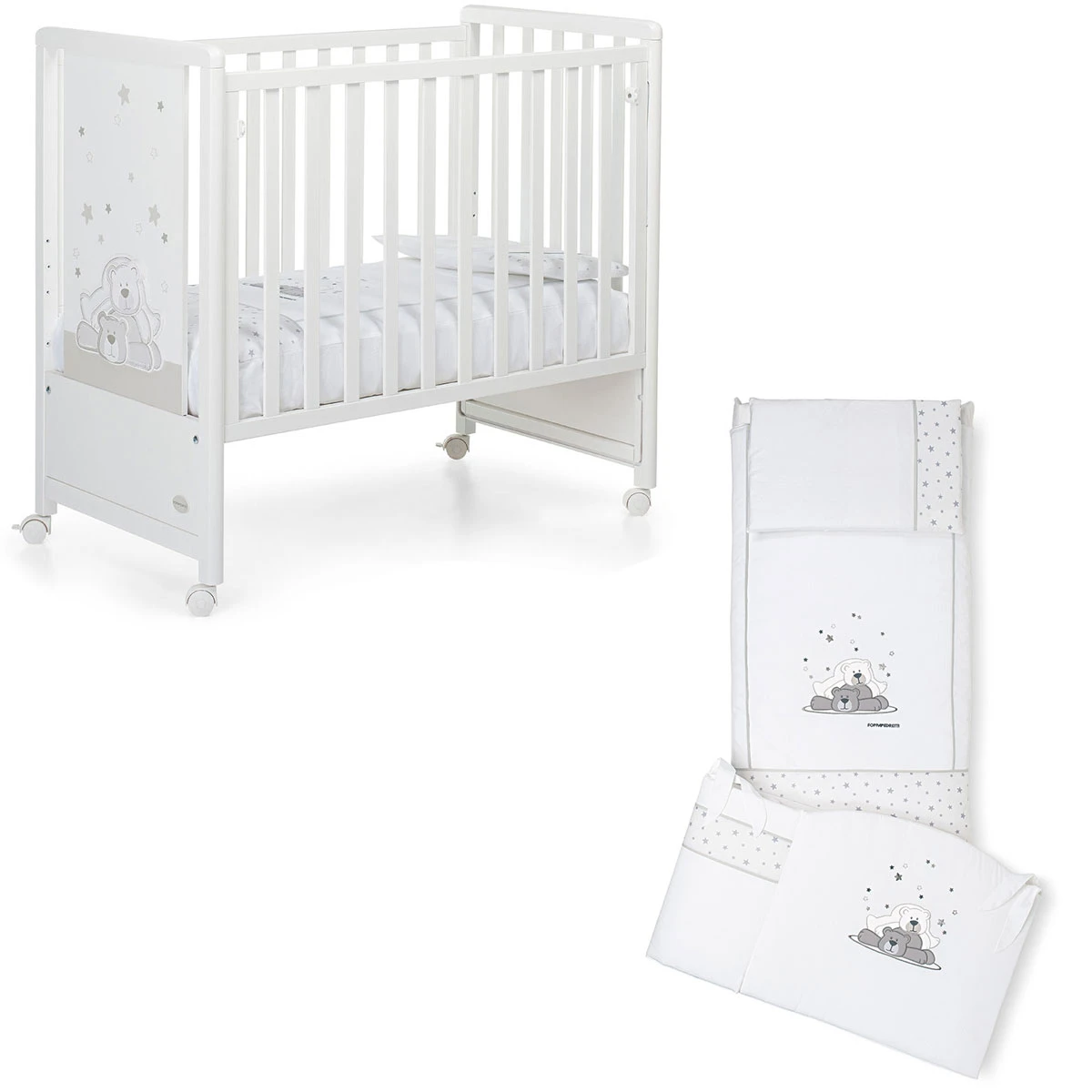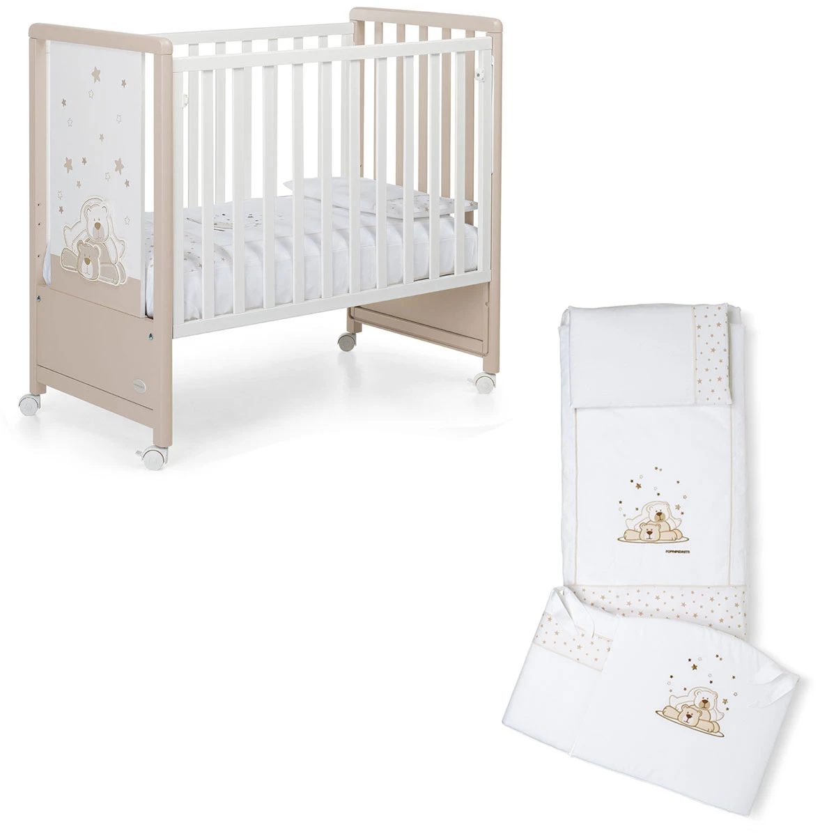 Foppapedretti Lettino Culla Pikkoletto Dolcestella con Set Piumone Letto è una culla molto ampia (106 x 61 cm) ed è progettato per permette di far dormire il bambino affianco al lettone dei genitori. La sponda laterale è regolabile in due altezze, può essere posizionata sia a destra che a sinistra per facilitare il riordino del lettino. Grazie alla sponda abbassabile il lettino può essere utilizzato anche come comodo divanetto. La rete a doghe è regolabile in 4 altezze e anche nella posizione anti-reflusso, ossia leggermente reclinata. Il Lettino Pikkoletto Dolcestella è realizzato interamente in legno massiccio di faggio e verniciato con colori atossici, dotato di 4 ruote piroettanti. Incluso il materasso e il Set Letto con Paracolpi imbottito (h 42 x p 5 x l 186 cm), Piumone sfoderabile (h 31 x l 48 cm) e Federa cuscino in cotone (h 125 x p 5 x l 108 cm).