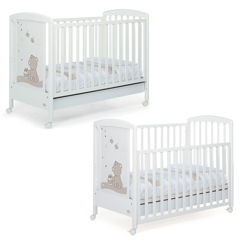 Foppapedretti Lettino Golosone in Legno con Sponda Regolabile è ideale per accompagnare il neonato nella crescita fino alla prima infanzia: grazie alla sponda e alla rete regolabile a due altezze, la sponda inferiore accoglie il neonato e agevola l’accesso ai genitori, mentre la sponda superiore è progettata per i bambini più grandi, rendendo il lettino sicuro e protetto ad ogni età. Lettino Golosone è verniciato con colori sicuri e atossici ed è impreziosito da un grazioso orsetto goloso di miele e circondato da tenere api volanti. Lettino Golosone Foppapedretti è dotato di ampio cassetto inferiore, suddiviso in due scomparti, e ruote con sistema frenante, per facilitare gli spostamenti.