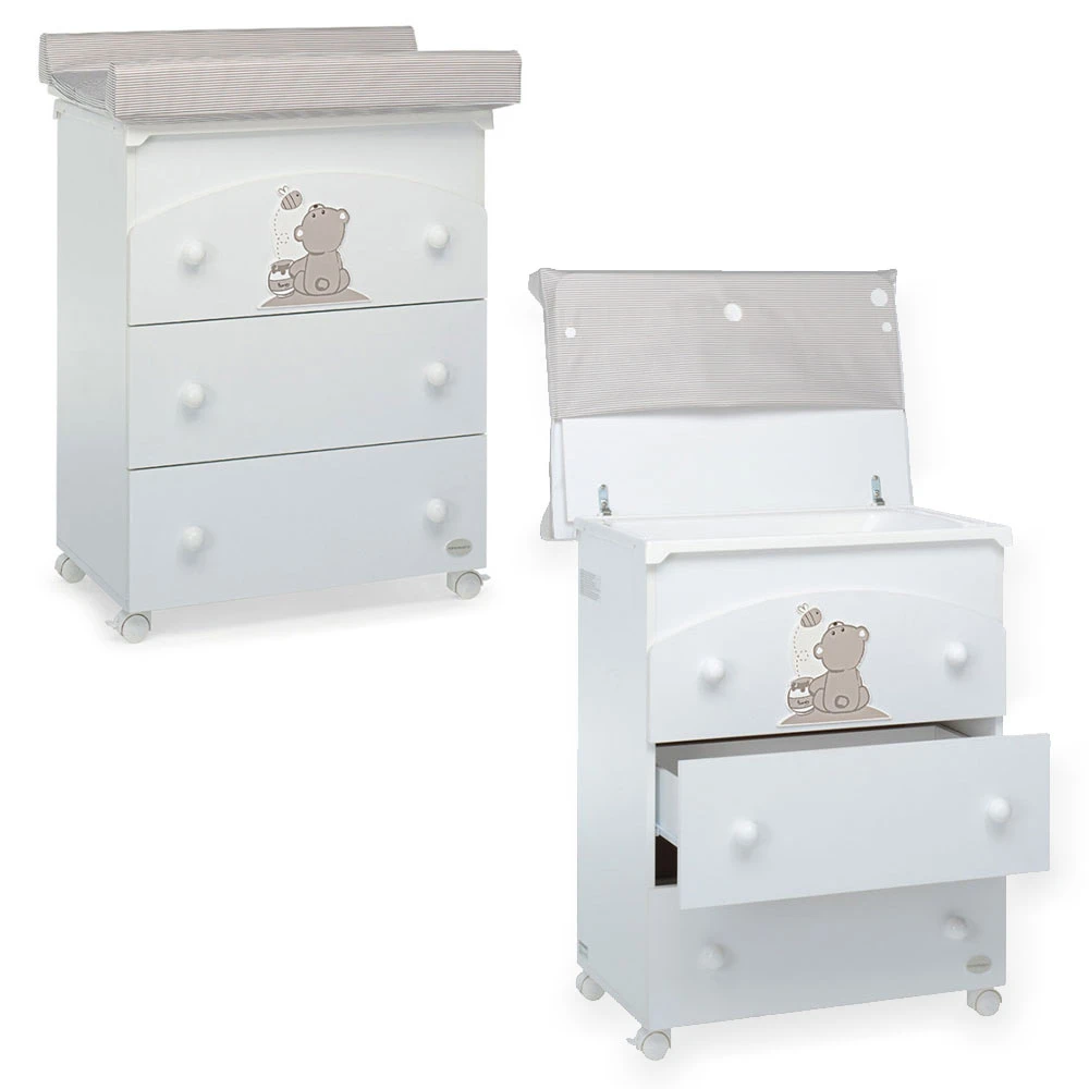 Foppapedretti Bagnetto Fasciatoio Neonato Golosone con Vaschetta Estraibile, Cassetti e Piano Ribaltabile è dotato di 3 ampi cassetti per gli indumenti del neonato, vaschetta estraibile, materassino fasciatoio e piano ribaltabile con sistema di sicurezza ammortizzato. Golosone Bagnetto Fasciatoio è dotato di ruote gommate antigraffio che facilitano gli spostamenti. Il cassetto superiore è decorato con un orsetto golosone di miele nelle tinte del marrone e bianco. Il Bagnetto Golosone Foppapedretti è realizzato in robusto legno ed è un prodotto Made in Italy.