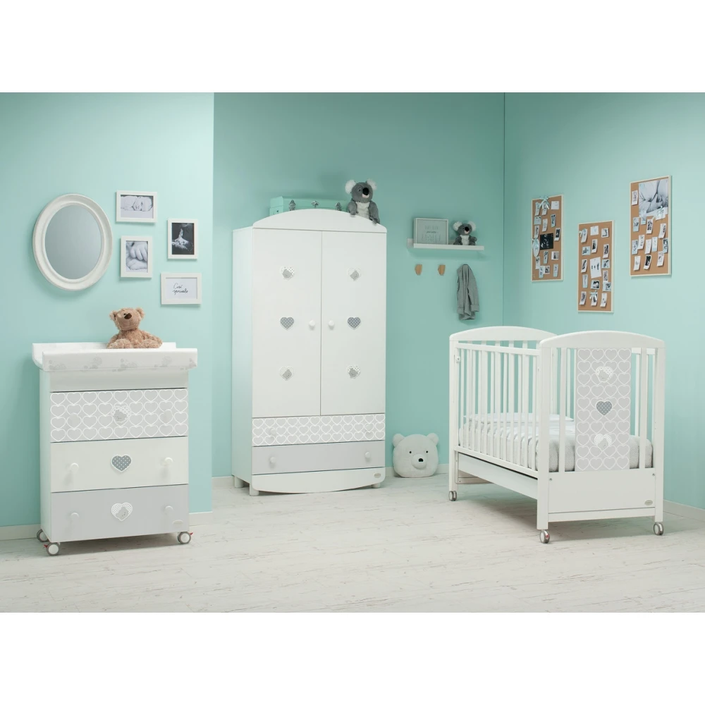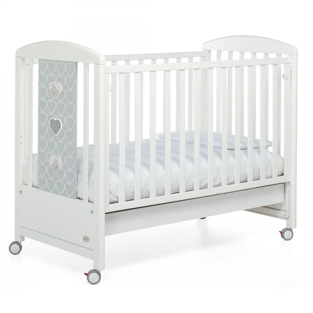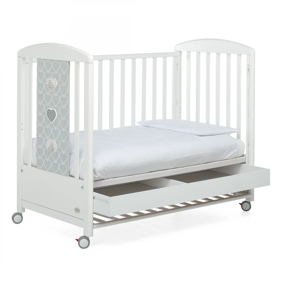 Foppapedretti Lettino Lovely con Sponde Regolabili di Foppapedretti ha una sponda regolabile a due altezze, che facilita il riordino del lettino e può anche essere abbassata a scomparsa per trasformarlo in un comodo divanetto. Una delle testate del lettino è decorata con teneri cuori in rilievo che racchiudono un dolcissimo orsetto. Foppapedretti Lettino Lovely ha un ampio cassetto inferiore, suddiviso in due scomparti, e ruote gommate antigraffio, con sistema frenante, per facilitare gli spostamenti. La solida struttura in legno massiccio di faccio è verniciata con vernici atossiche. 100% Made in Italy!