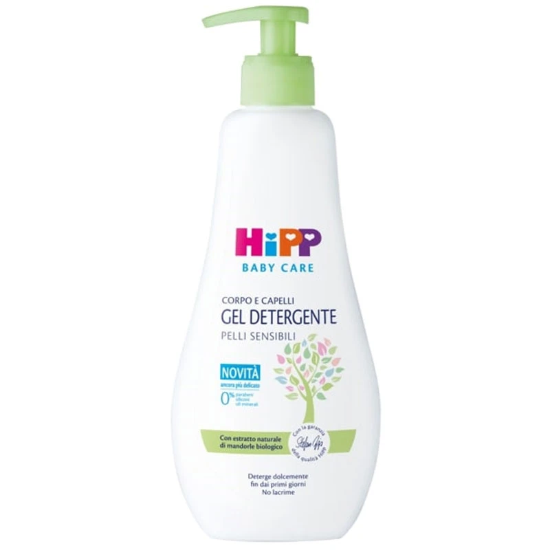 Hipp Gel Detergente Corpo e Capelli per pelli sensibili, 400ml di Hipp contiene Estratti di Mandorle bio, è molto delicato grazie alla sua formula senza sapone ed è ideale per detergere la pelle e i capelli dei più piccoli. Protegge il manto acido protettivo della pelle durante il bagno o la doccia.