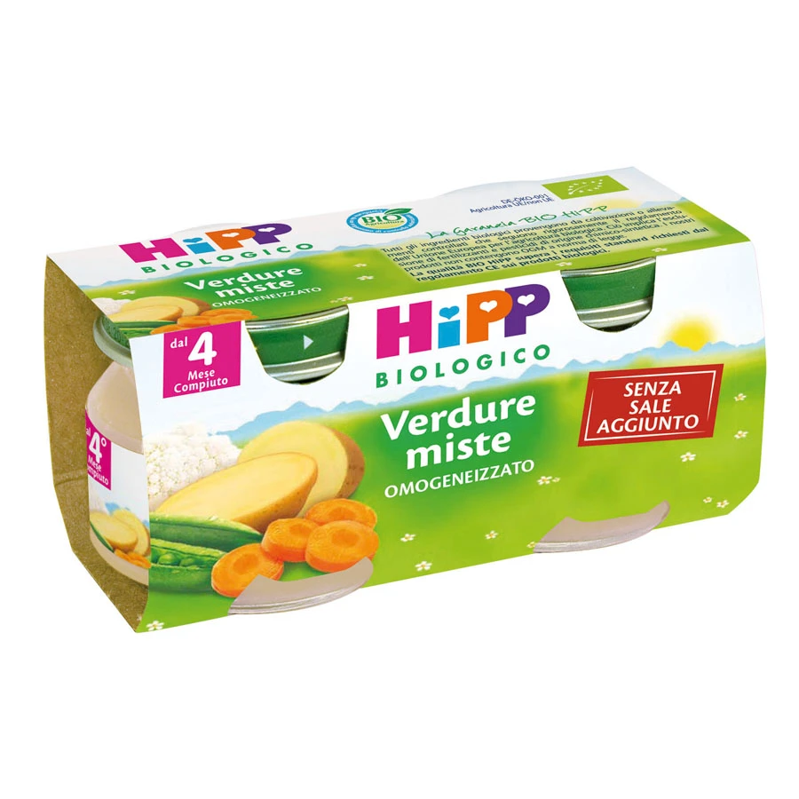 Hipp Omogeneizzato Verdure Miste 2 x 80 g. L’omogeneizzato di verdure miste HiPP contiene solamente le varietà più adatte al periodo dello svezzamento (patate, carote, piselli, cavolfiore) per creare un mix al tempo stesso saporito e delicato, perfetto per arricchire le prime pappe.