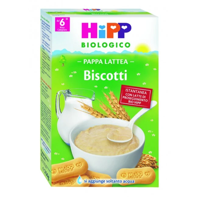 Adatta a partire dal 6° mese, secondo il parere del pediatra, la pappa lattea bio biscotti è ideale a colazione grazie alla combinazione di preziosi cereali biologici (avena, frumento e farro) e latte biologico di proseguimento Hipp.