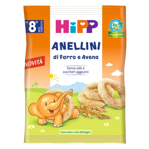 Gli Anellini di Farro e Avena di HiPP, indicati a partire dall’8° mese compiuto del tuo bambino, secondo il parere del pediatra, sono lo snack ideale da sgranocchiare con i primi dentini.