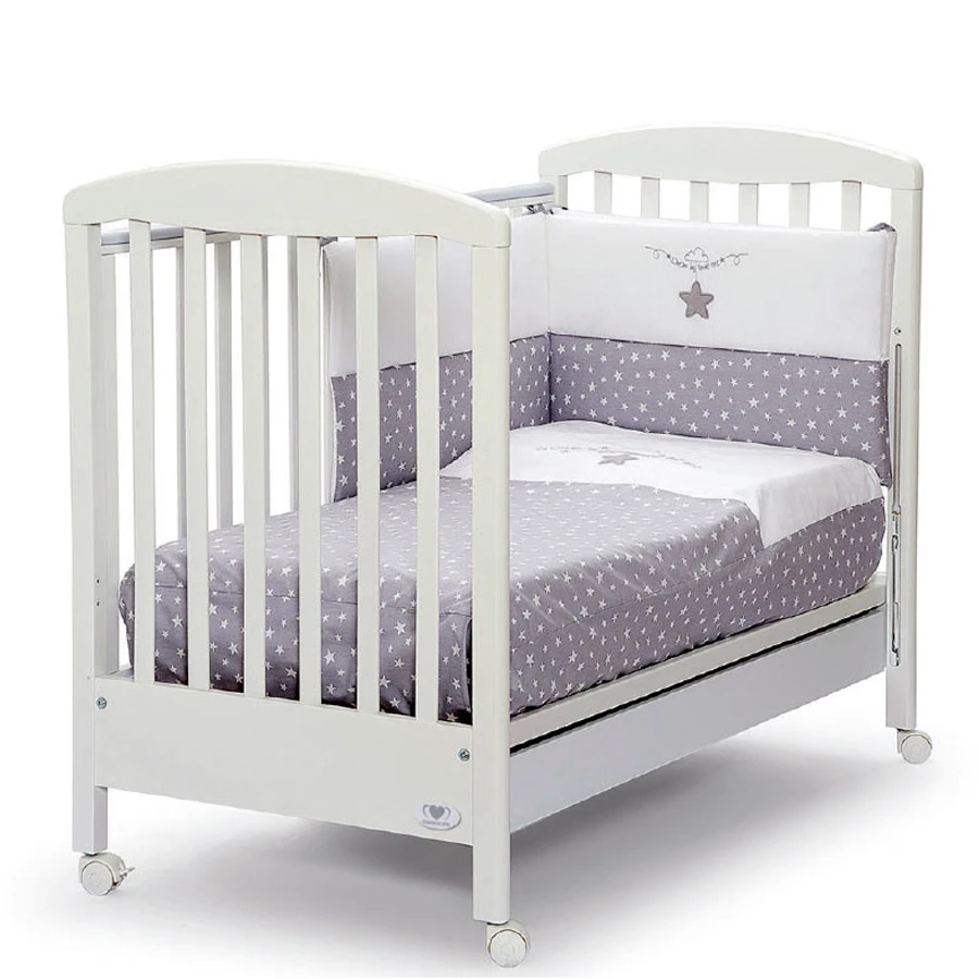 Il lettino Mio ha una struttura semplice con una spondina che si alza e sia abbassa: questo permette di usarlo in varie fasi della crescita e permette la gestione della manutenzione in modo semplice.
