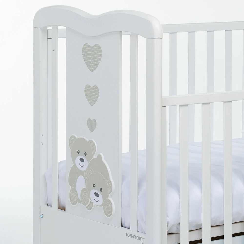 Una delle testate del lettino ha un pannello con raffinate decorazioni: due simpatici e teneri orsetti insieme a tre cuoricini nello stesso tono di grigio.