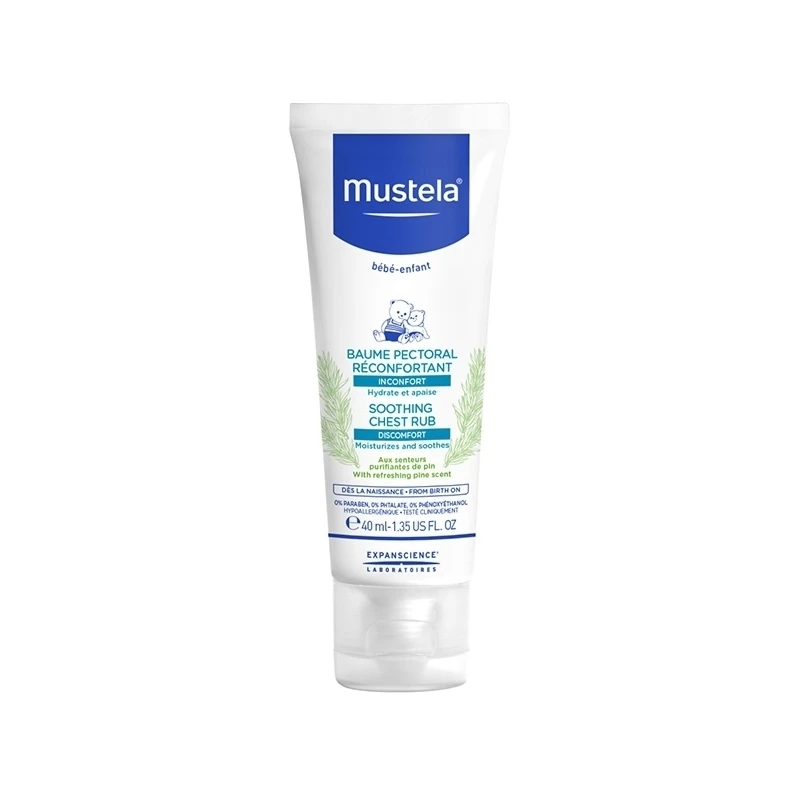 Mustela Crema Massaggio Balsamica Rinfrescante e Lenitiva 40ml di Mustela è una crema balsamica con azione lenitiva e rilassante, grazie alla fragranza di pino purificante e rinfrescante. Applicarla prima della nanna permette al bambino di rilassarsi e rende indisturbato il sonno durante la notte. Il forte profumo balsamico ostruisce le vie nasali intasate. Perfetta durante i cambi di stagione o nelle notti invernali più fredde. Contiene estratti di origine naturale e fragranza di pino purificante e rinfrescante che idrata e lenisce fin dalla nascita, apporta benessere e relax al bambino. Priva di Parabeni, Ftalati, Fenossetanolo.