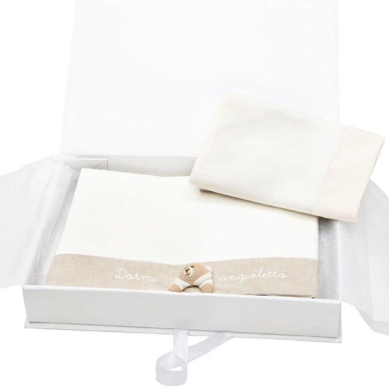 Nanan Set Lenzuola Lettino Tato Mini Me con Federa, Lenzuolo sopra e Lenzuolo con angoli di Nanan è realizzato in puro cotone e impreziosito da un tenero orsetto in ciniglia. Il Set Lenzuola Lettino Tato comprende: 1 fodera 32×40 cm, 1 Lenzuolo sopra 84×140 cm e 1 Lenzuolo Sotto con angoli 112×70 cm.