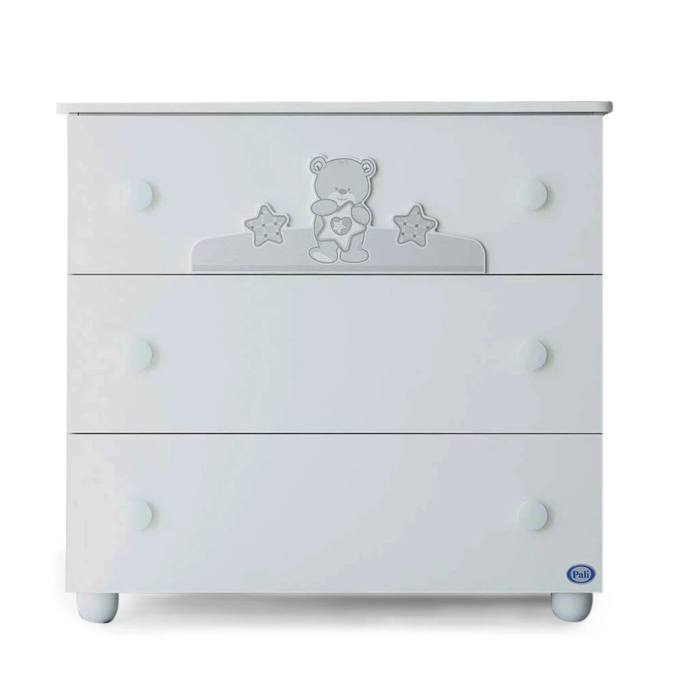 Pali Comò Birba Plus con Vaschetta Removibile per Bagnetto e Fasciatoio aggiunge un tocco di dolcezza in più alla cameretta del tuo bambino! Aiuta a mantenere ordinata la stanzetta grazie ai 3 cassettoni di cui è dotato. Realizzato in legno color bianco, Comò Birba è dotato di pomelli e un piano d’appoggio superiore su cui installare la vaschetta richiudibile per il bagnetto o il fasciatoio per il cambio. Il cassetto superiore è decorato con un dolce orsetto!