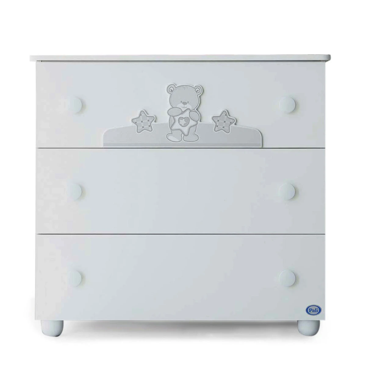 Pali Comò Birba in Legno aggiunge un tocco di dolcezza in più alla cameretta del tuo bambino o della tua bambina! Aiuta a mantenere ordinata la stanzetta grazie ai 3 cassettoni di cui è dotato da utilizzare per riporre biancheria, accessori e indumenti. Realizzato in legno color bianco, Comò Birba è dotato di pomelli e un piano d’appoggio superiore. Il cassetto superiore è decorato con un dolce orsetto!