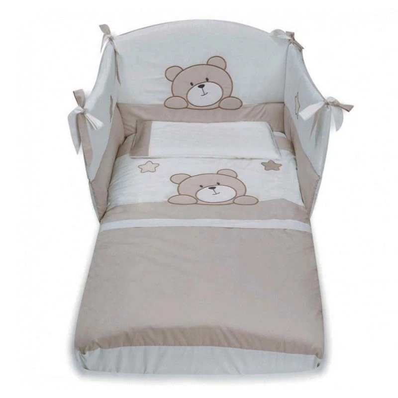 Pali Set Completo 3pz Piumone Imbottito, Federa e Paracolpi per Lettino Teo di Pali è realizzato in morbido cotone con ricami di orsetti e stelline. Comprende: Piumotto Sfoderabile Imbottito, Paracolpi a Tre Lati Imbottito, Federa per Cuscino.