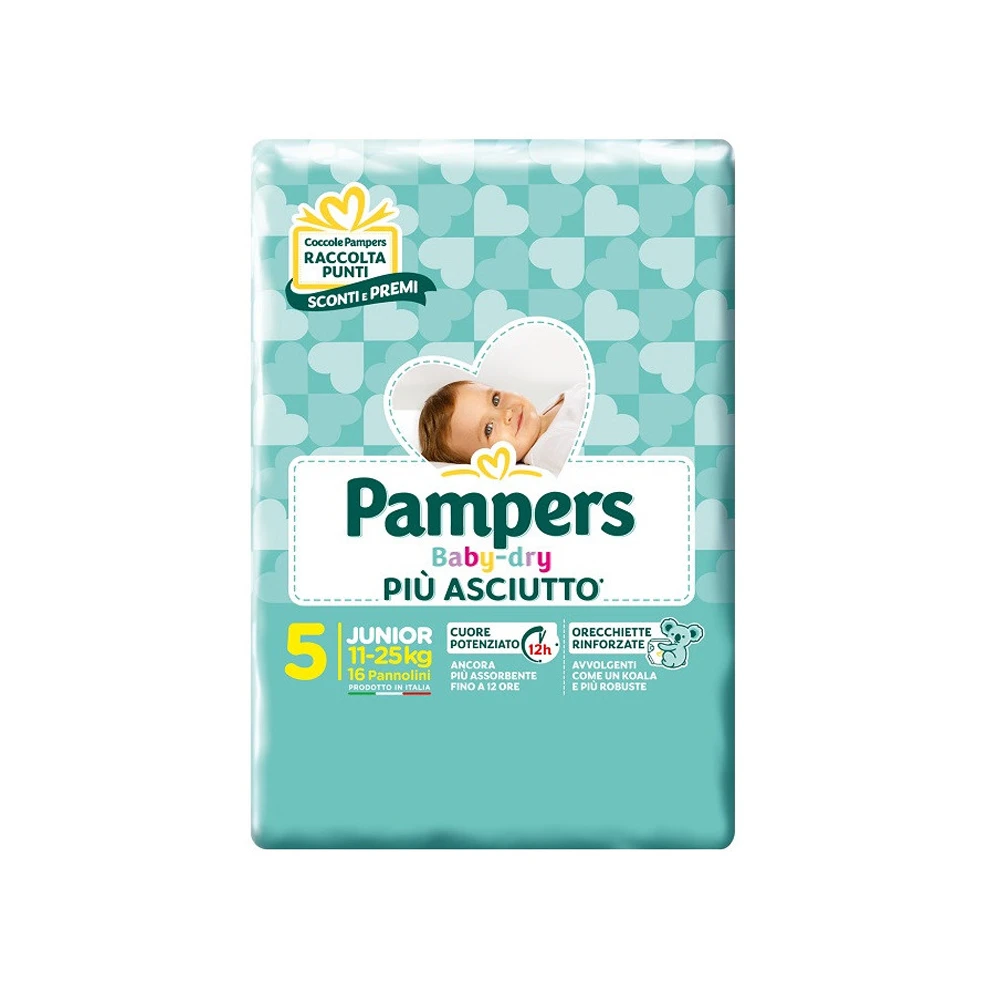 I Pannolini Pampers Baby Dry Downcount Junior Taglia 5 (11-25 kg) sono pannolini che offrono al tuo bambino asciutto e delicatezza. Grazie al sistema filtrante sono super assorbenti mentre la lozione con Aloe è delicata per la pelle del tuo bambino. I Pannolini Pampers Baby Dry Downcount Junior Taglia 5 (11-25 kg) bloccano il bagnato lasciando passare liberamente l’aria al suo interno, per una naturale traspirabilità. Inoltre, il pannolino è dotato di speciali barriere e di una vestibilità super-avvolgente.