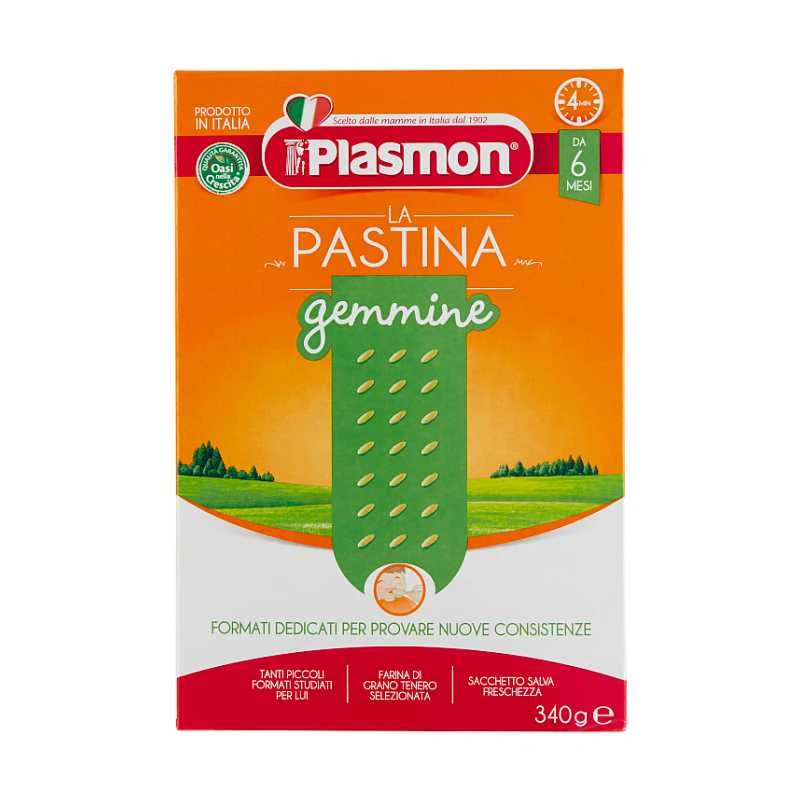 Plasmon Gemmine Pastina ideale per i primi dentini, grazie alla morbidezza del grano tenero che lo incoraggia a masticare. Con calcio, ferro e vitamine, importanti per una crescita equilibrata. Ideale dal 6° mese compiuto, salvo diversa indicazione del Pediatra. Ingredienti Farina di frumento; sali minerali (calcio, ferro); vitamine (B1, B2, B6, PP). Contiene glutine. Può contenere tracce di latte, lupino, uova. Modalità d’uso In brodo: portare ad ebollizione 200/250 ml di acqua o brodo vegetale, versare 2 cucchiai di pastina e cuocere per 4 minuti. Aggiungere altri ingredienti adatti al bambino per la pappa desiderata. Asciutta: portare ad ebollizione 500 ml di acqua, versare 2 cucchiai di pastina e cuocere per 4 minuti, quindi scolare. Aggiungere altri ingredienti adatti al bambino secondo la ricetta desiderata. Conservazione Conservare in luogo asciutto e lontano da fonti di calore.