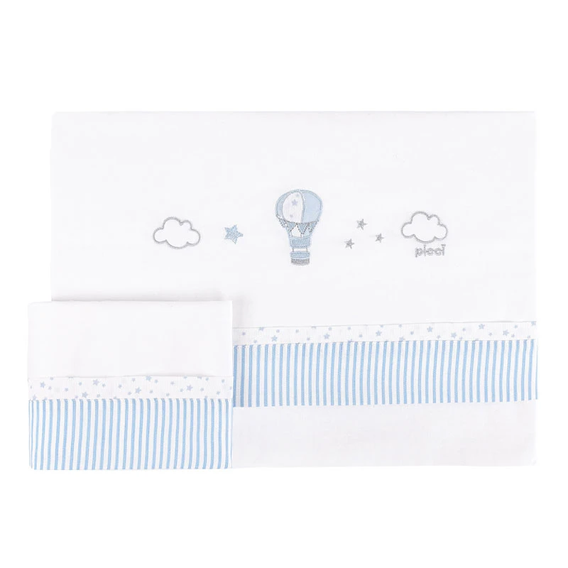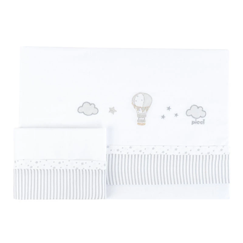 Picci Set Lenzuolo Sopra, Coprimaterasso e Federa per Letto Aria di Picci è composto da lenzuolo sotto con angoli 65x126cm, lenzuolo sopra 120x165cm, e federa per cuscino 60x40cm. É realizzato in 100% cotone ed è impreziosito con un ricamo di mongolfiera, stelle e nuvole, racchiuse da un’elegante bordo a righe. Decorato con un ricamo di mongolfiera, nuvole e stelle e un delizioso bordino a righe che lo rendono fine ed elegante. Si adatta sia alla culla Aria che alla carrozzina. Consigliato lavaggio in lavatrice a 40°. Colori disponibili: Celeste, Grigio, Rosa