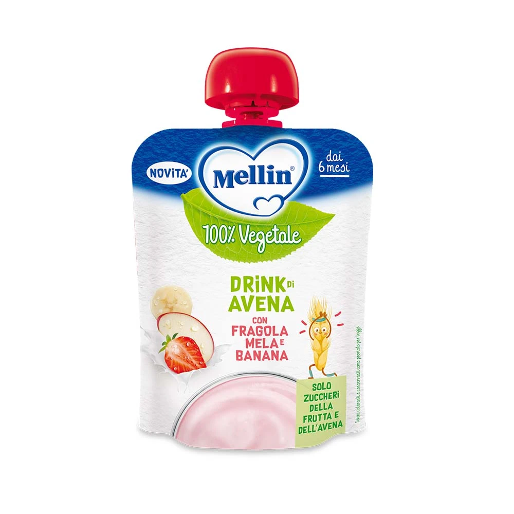 Pouch 100% Vegetale Avena, Fragola, Mela e Banana 90g di Mellin. Merenda 100% Vegetale con drink di avena, fragola, mela e banana. Solo zuccheri della frutta e dell’avena.