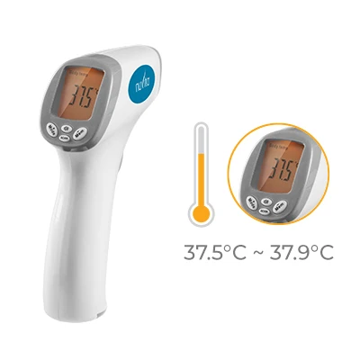 Allarme febbre con suono e colori: Se la temperatura è al di sopra della norma (dati preimpostati a 38 °C/100.4°F), il termometro digitale No-Contact Nuvita senza contatto emetterà un suono di allarme. Nuova caratteristica! I colori del display cambieranno dal verde (38°).