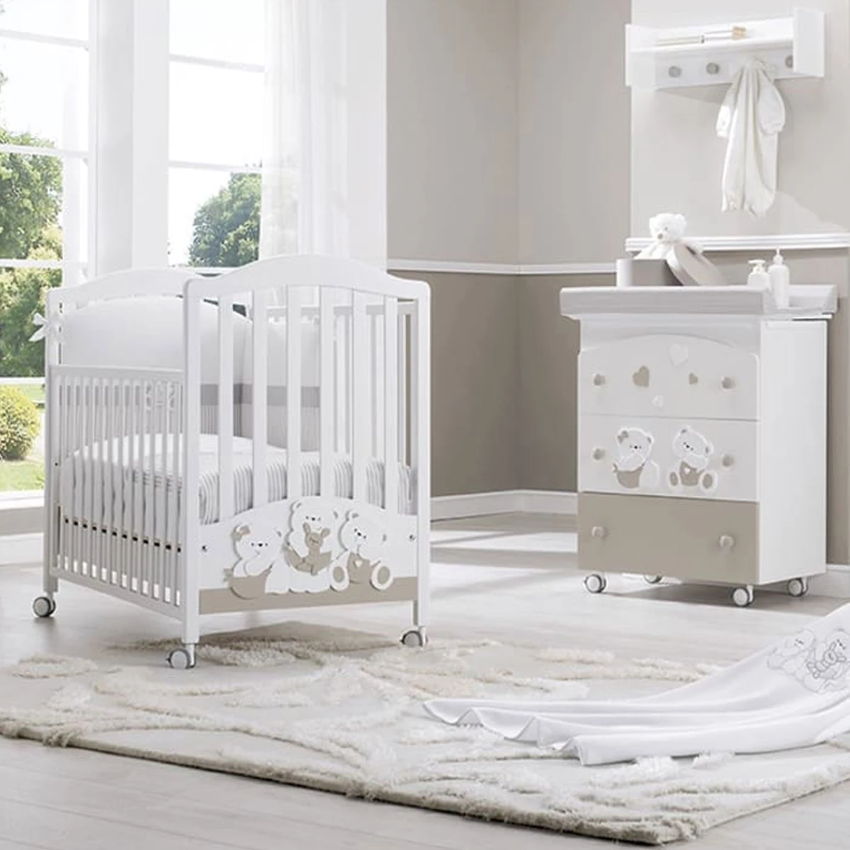 Tris B Letto + Bagnetto + Completo Piumone Mirtillo di Erbesi propone tutto il necessario per arredare con stile e praticità la prima cameretta del tuo bambino! É un set composto da Lettino Mirtillo, Bagnetto/Fasciatoio Mirtillo e Completo Piumone Mirtillo, è ideale per accogliere il tuo bambino dalla nascita fino ai primi anni di vita. Disponibile nel colore Bianco/Tortora.